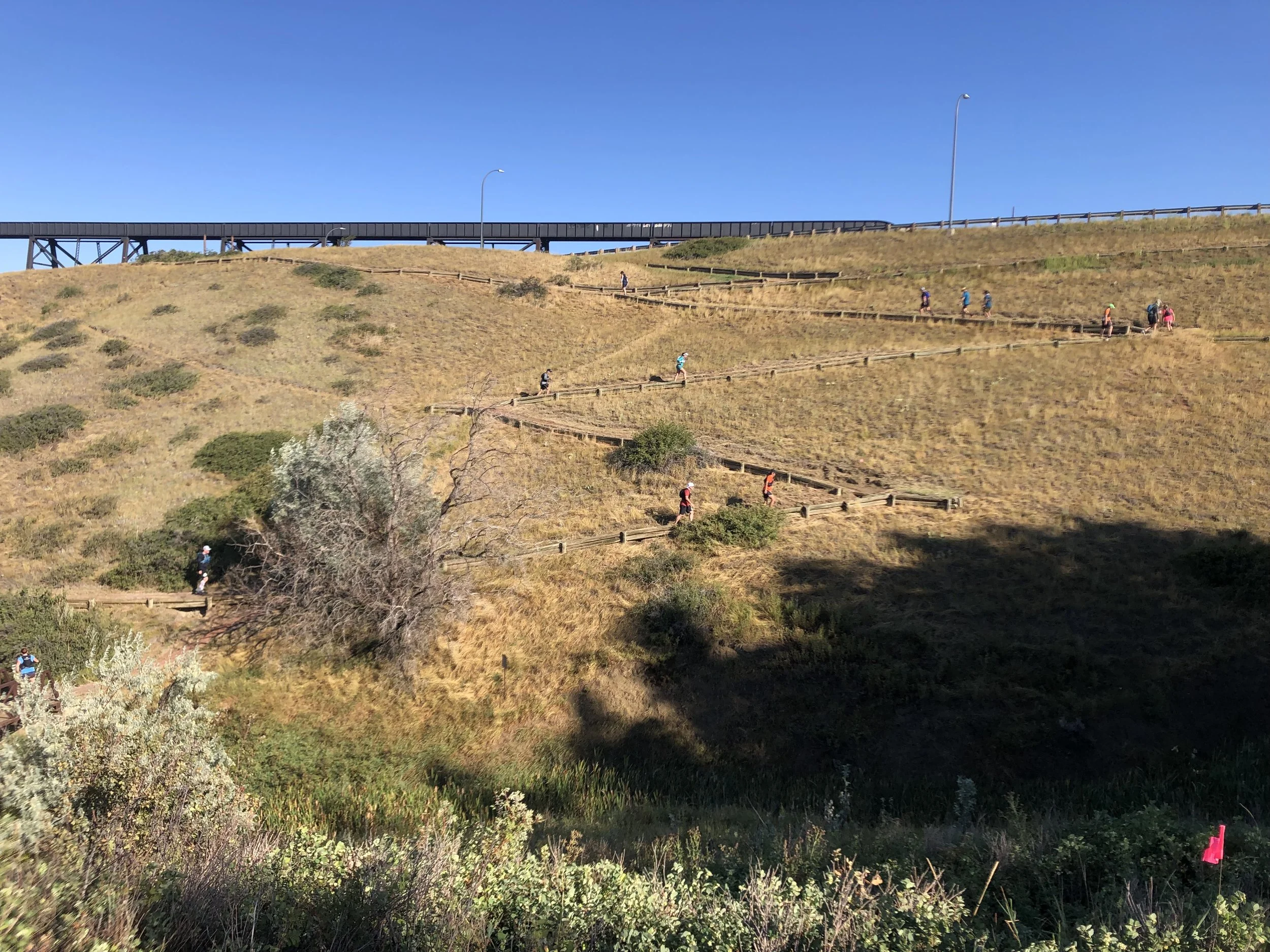 With everyone eventually rounded up and ready to go the group got the all clear and we were off, as you can imagine this wasn’t a blistering 100m start. The pace was slow and steady. I had plenty of time to take in my surroundings and chat to the other athletes around me. I’d decided not to bring hiking poles which I now realized was a mistake after going up the first couple of coulees. Luckily my friend Genni was yet to arrive and so she picked up a pair of poles for me on her way. These proved to be a blessing going up and down hills as my legs started to fatigue later on in the race.